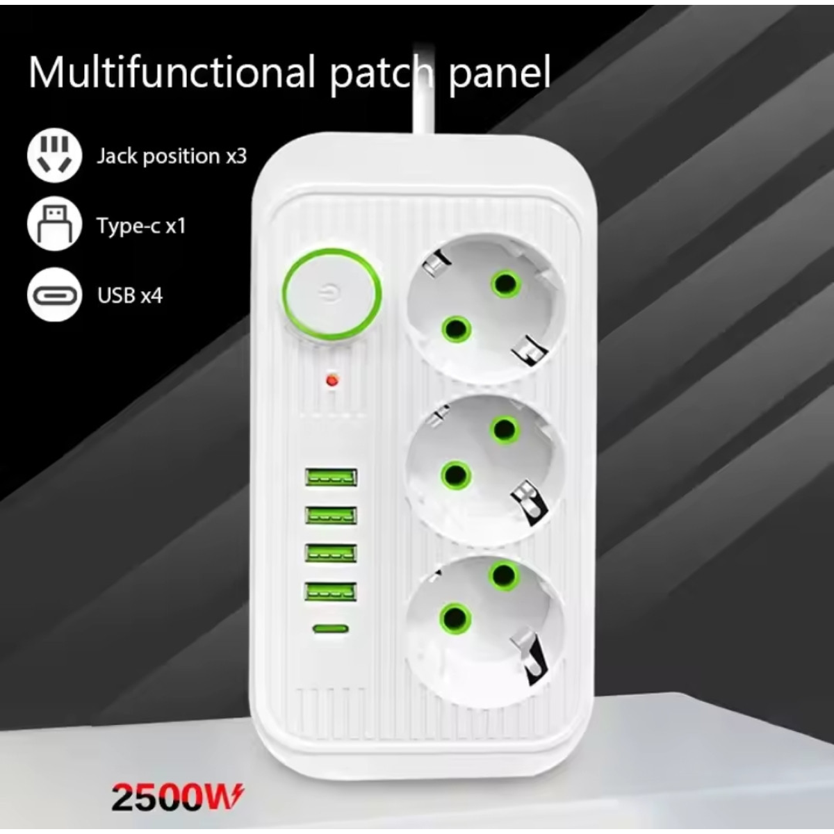 Подовжувач на 2500w з юсб на 3 розетки чорний 2м